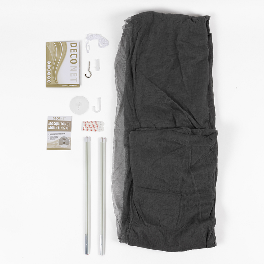 De klamboe hang je eenvoudig op met de meegeleverde schroefhaak en touwtje en met maar aan één punt, geen gedoe met veel gaten en schroeven.