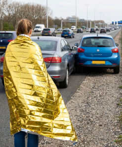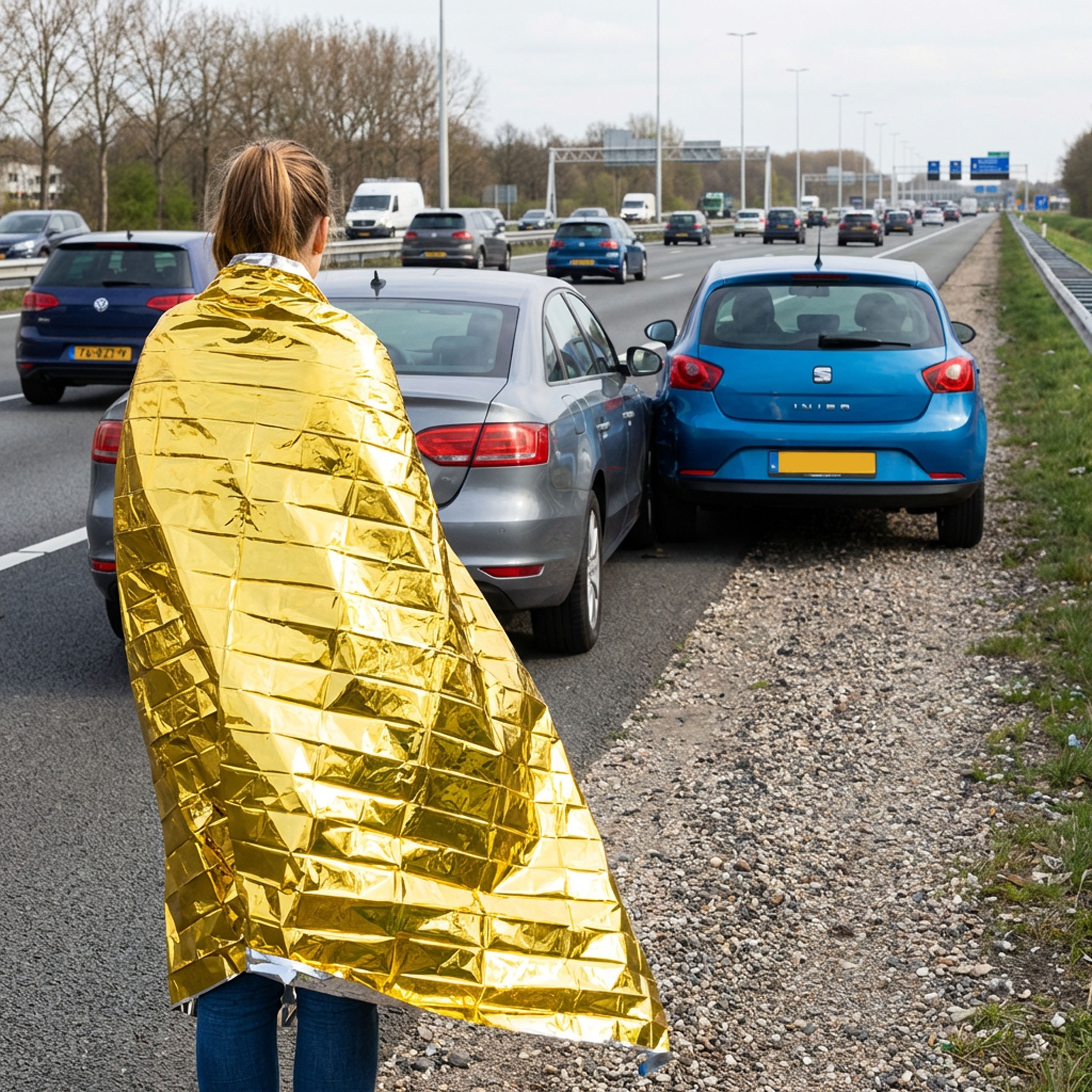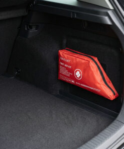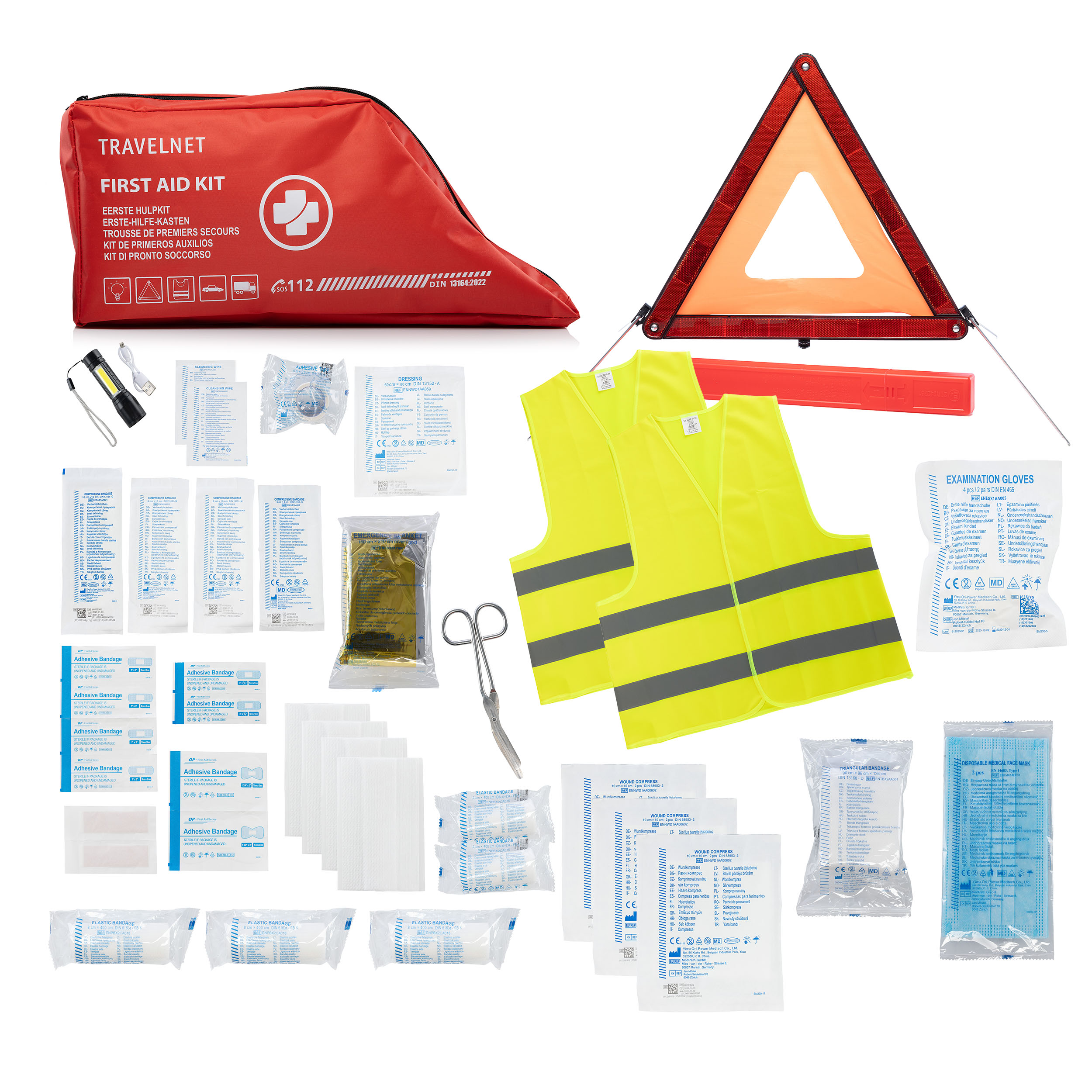 Naast diverse pleisters, verbanden en wondverzorgingsmaterialen bevat de set ook een nooddeken, veiligheidsdriehoek, veiligheidsvesten en een zaklamp.