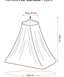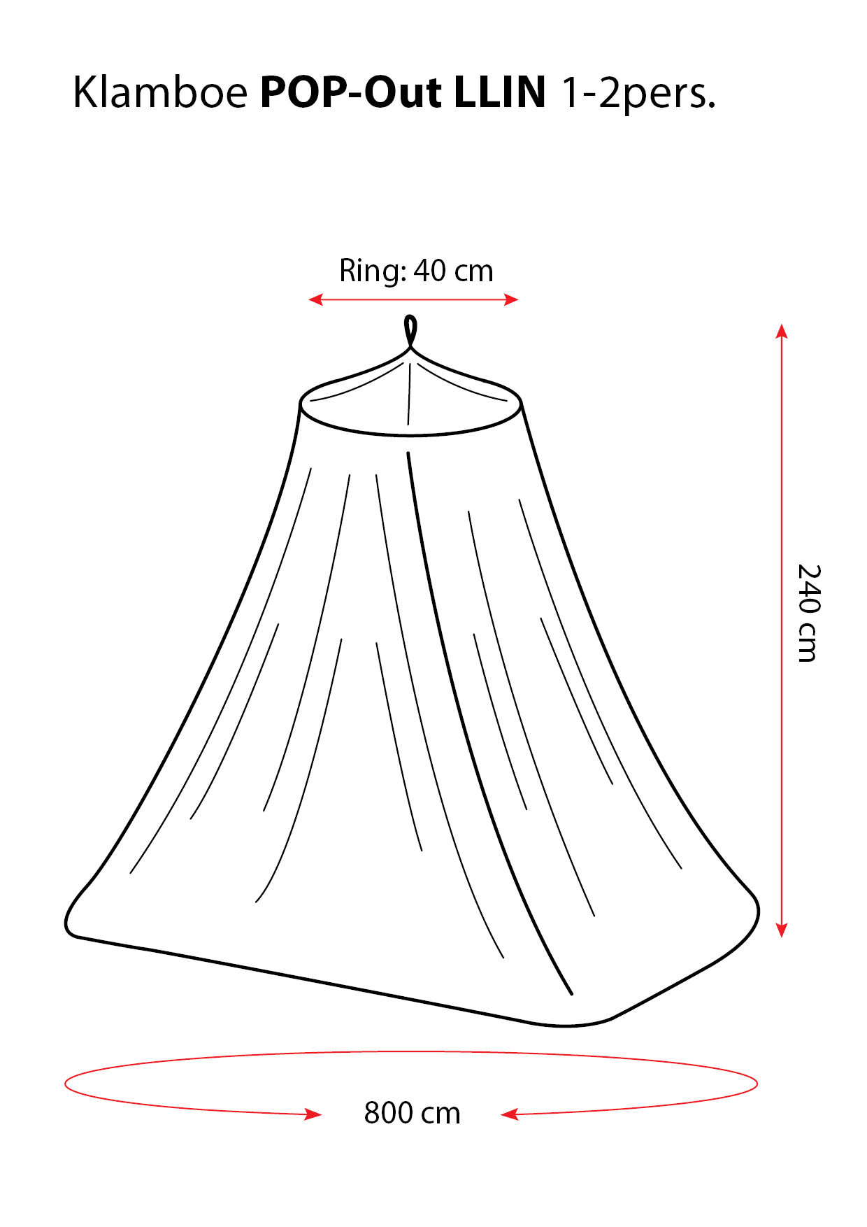 De Pop Out I heeft een totale omtrek van 800cm en is daarom geschikt voor (lucht)bedden van 160x200cm. Met een hoogte van 240cm en door middel van het meegeleverde touwtje hang je de klamboe op een geschikte hoogte met slechts 1 ophangpunt.